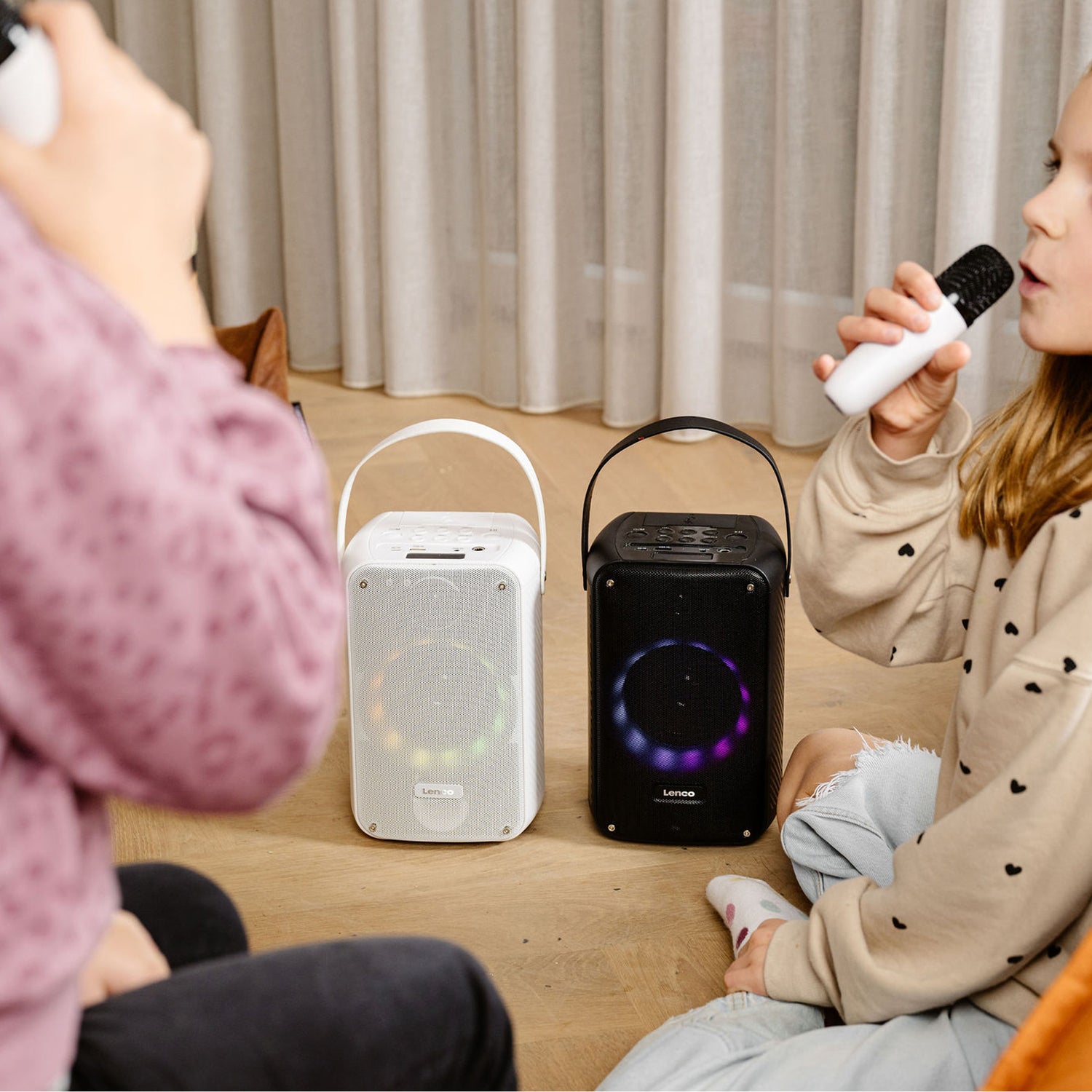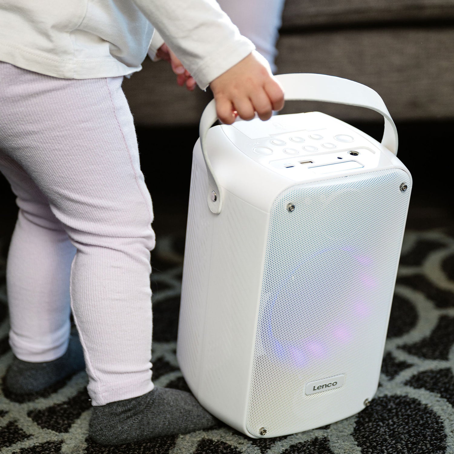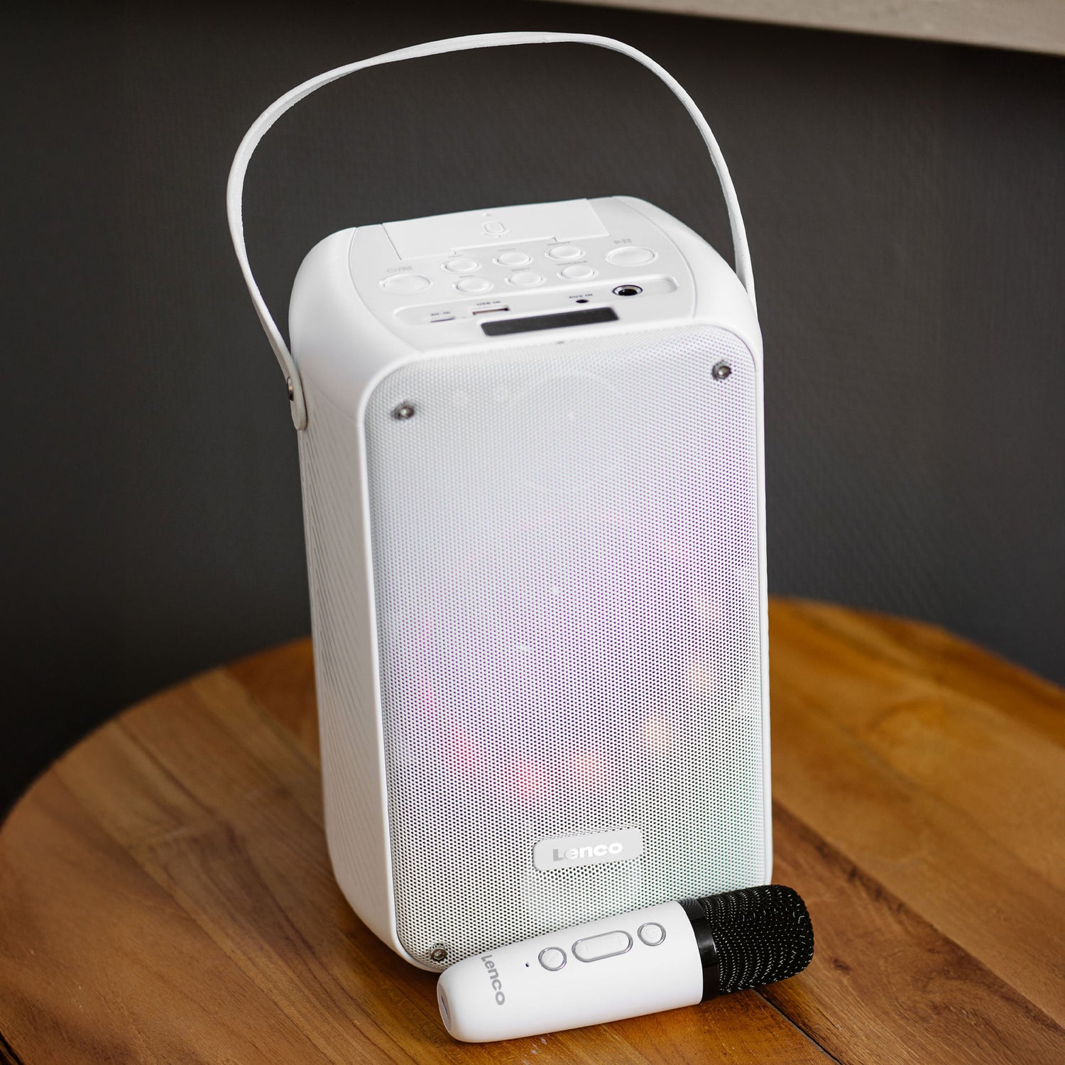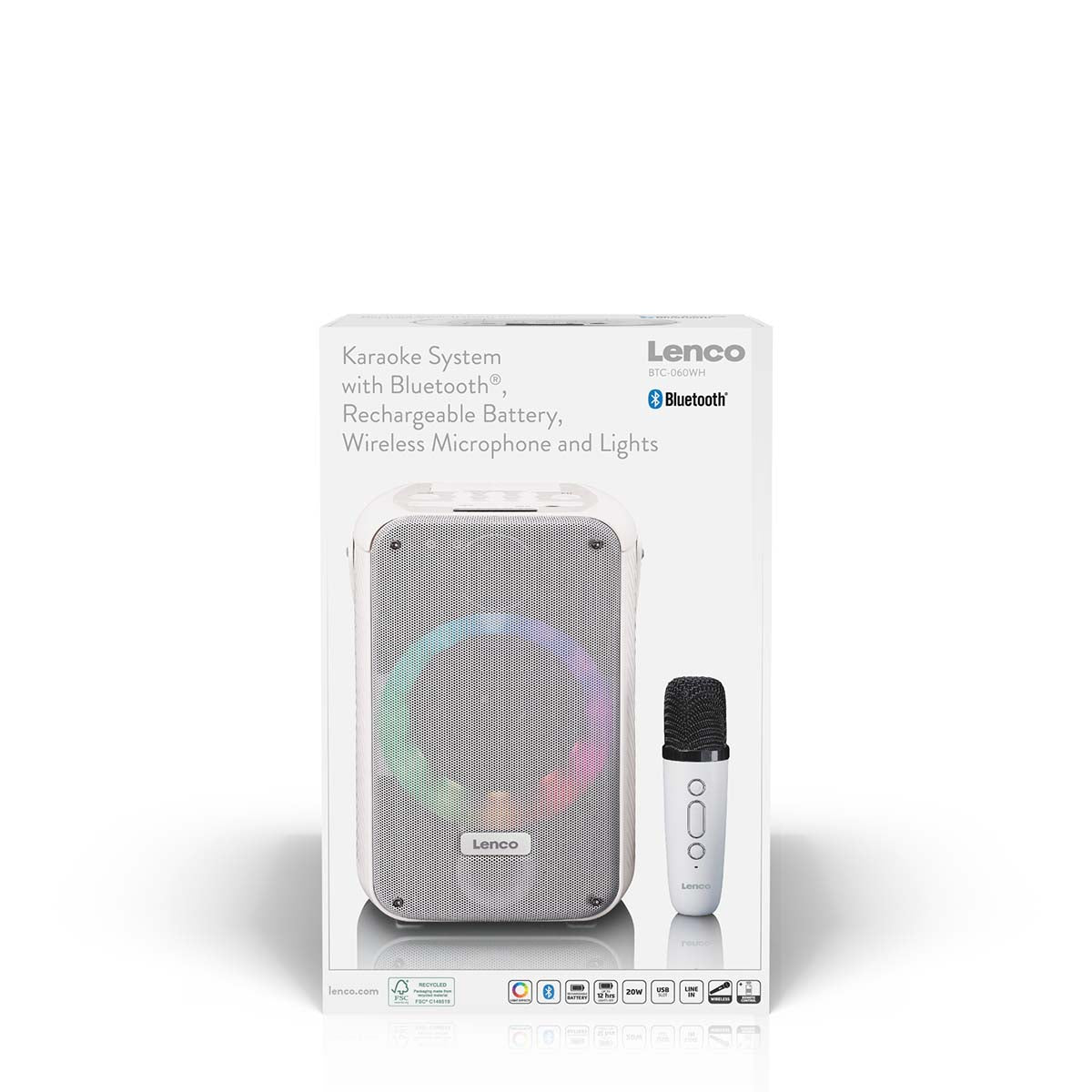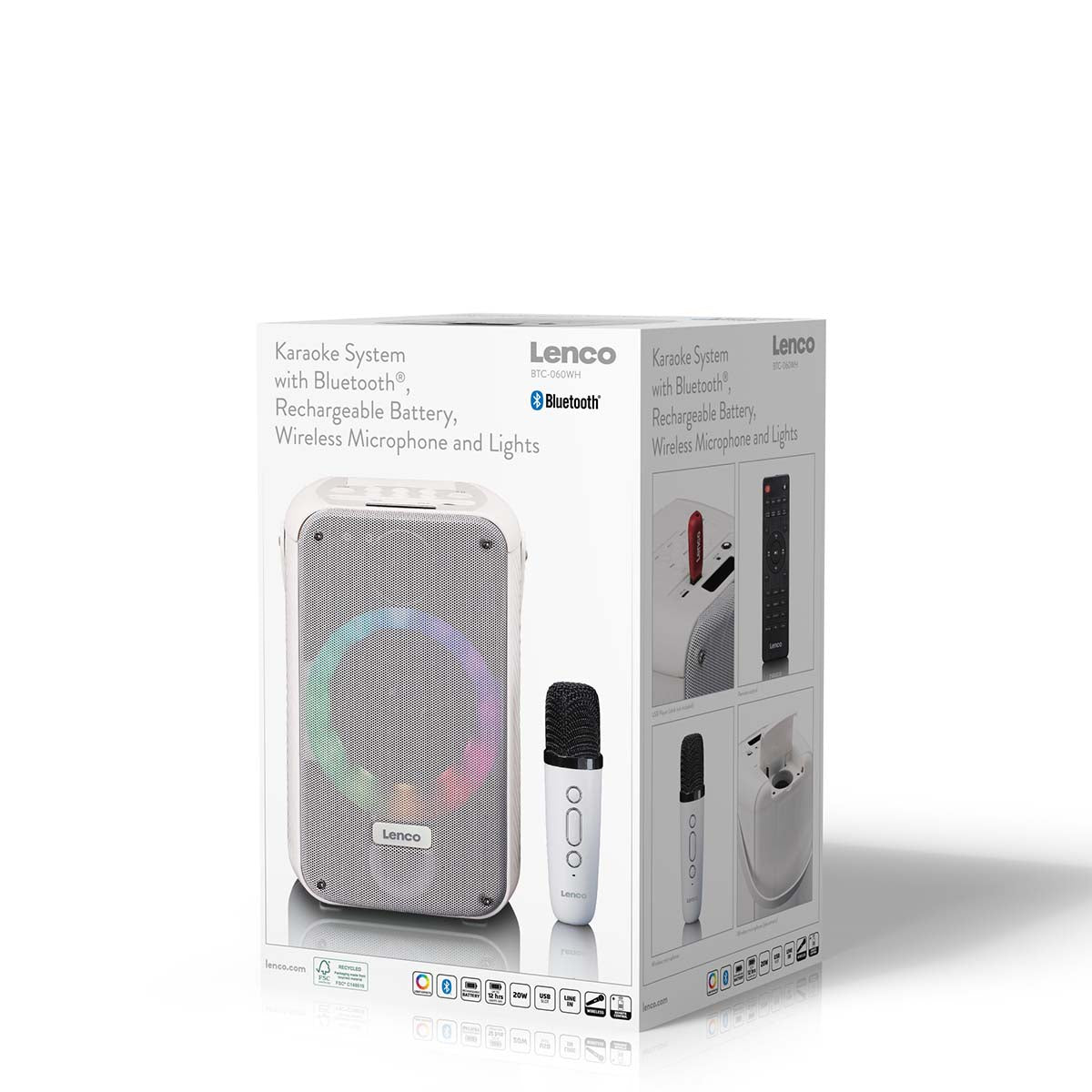 Met de Lenco BTC-060WH haal je direct een complete karaoke set in huis, voorzien van onder andere Bluetooth®, oplaadbare batterij, draadloze oplaadbare karaoke microfoon, disco LED-verlichting en een afstandsbediening met geluidseffecten en stemvervormer. We kunnen het ons bijna niet voorstellen, maar ben je geen fan van karaoke? Ook dan ben je bij de BTC-060WH aan het juiste adres. De karaoke microfoon berg je gemakkelijk op in de Bluetooth speaker. Dankzij het draagbare ontwerp en een gewicht van slechts 1,42 kg kun je de speaker vervolgens overal mee naar toe nemen. Geniet van maximaal 12 uur ononderbroken plezier dankzij de ingebouwde oplaadbare batterij. Met de Lenco BTC-060WH heb je letterlijk het feestje in eigen hand! Let's get this (karaoke) party started!