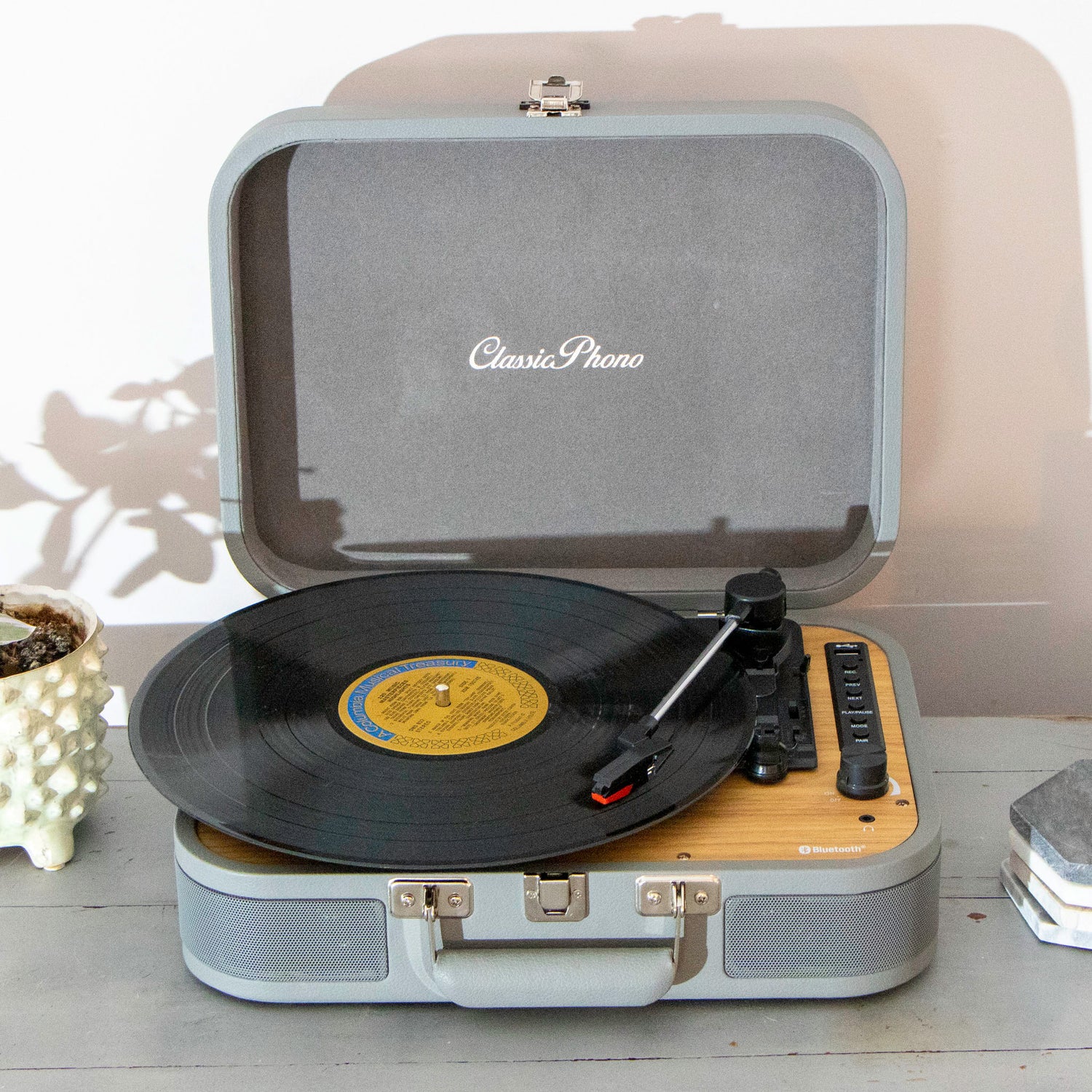 Geniet van jouw favoriete muziek met de stijlvolle retro Bluetooth platenspeler Classic Phono (by Lenco) TT-116GY met ingebouwde speakers. Met deze handige retro koffer platenspeler speel je niet alleen je vinyl platen af. Stream eenvoudig jouw favoriete nummers naar de ingebouwde speakers via je telefoon of tablet. Bovendien is het mogelijk de afgespeelde muziek direct op USB op te nemen.