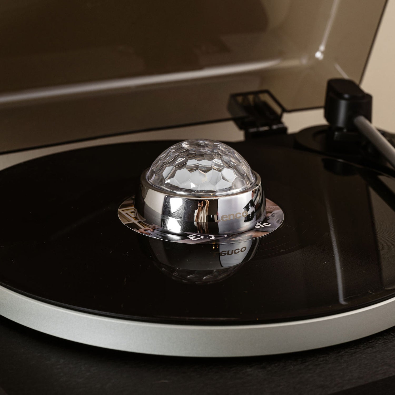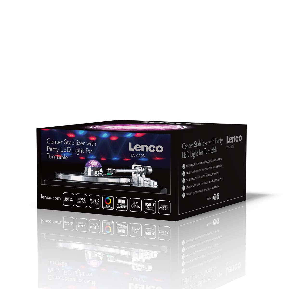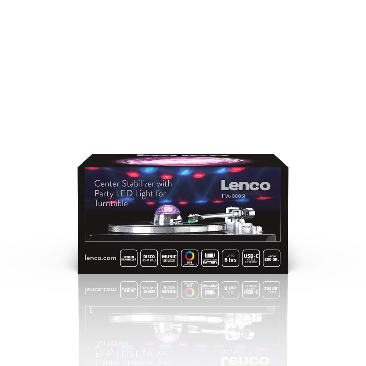 Whether you’re an audiophile seeking perfection in sound reproduction or someone looking to add a touch of extra atmosphere to your record playing, the Lenco TTA-080SI is the perfect record player accessory. The Lenco TTA-080SI is an innovative record stabiliser, also known as a record player weight, that can be easily placed in the centre of the record player's platter. Weighing 250 grams and doubling as a disco ball with RGB light effects, the stabiliser gently presses on the record, ensuring uniform contact with the turntable. This reduces vibrations and keeps the record securely in place, resulting in a more stable rotation. A stable rotation, in turn, contributes to precise and balanced sound reproduction. The unique combination of technical precision and a playful, festive design makes the Lenco TTA-080SI the perfect gift for any record player enthusiast.