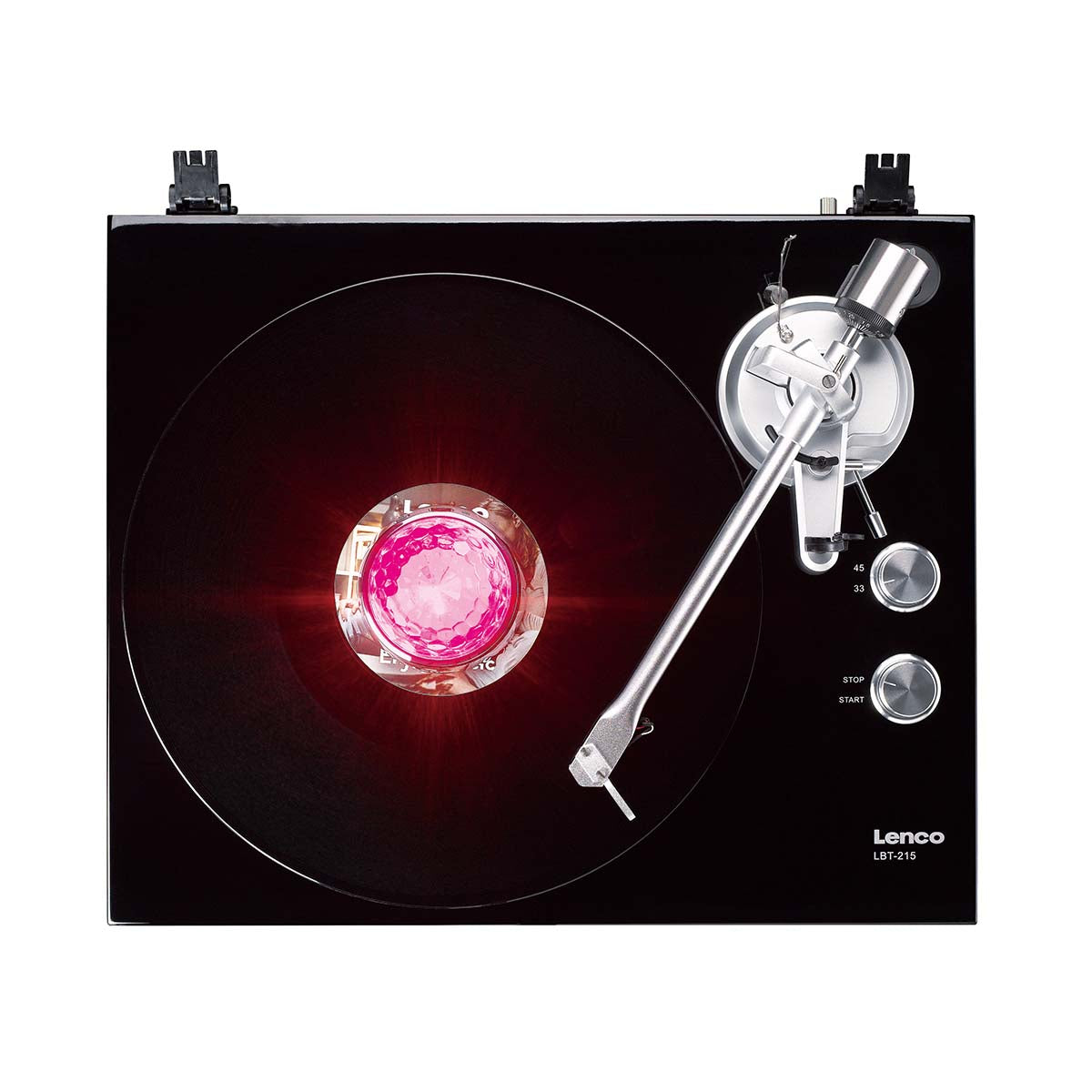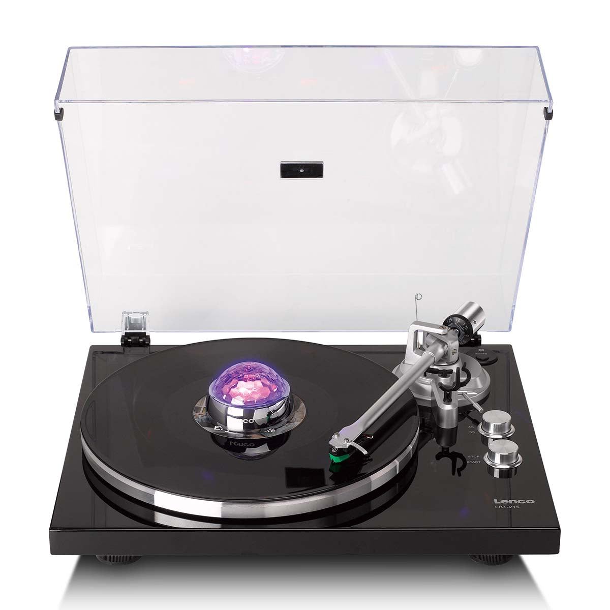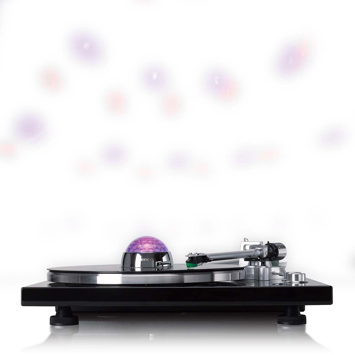 With a weight of 250 grams, this centre stabiliser applies perfect pressure on your vinyl record. This minimises vibrations and keeps the record firmly in place, ensuring stable rotation and pure, balanced sound reproduction. - Disco light with adjustable sensitivity to match the music's beats