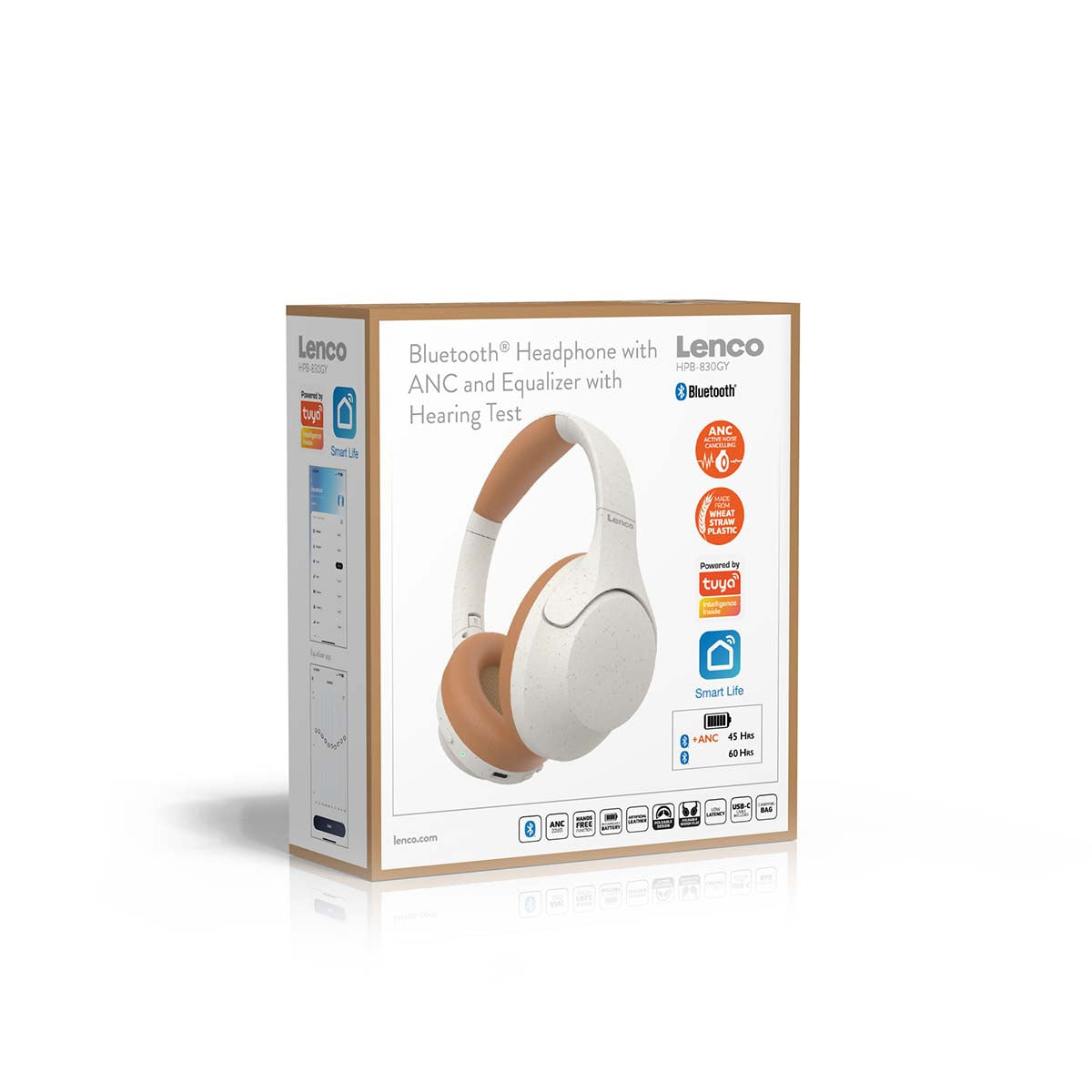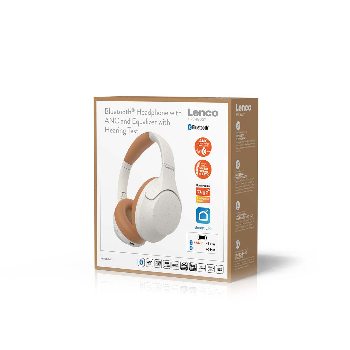 The Lenco HPB-830GY wireless Bluetooth® headphones with an over-ear design offer an enhanced fit, improved sound quality, and smarter features. Thanks to the comfortable and adjustable headband and cushy ear cushions, the HPB-830GY provides a secure fit, making the headphones suitable for everyone. Additionally, these headphones feature Active Noise Cancelling (ANC), also known as active noise suppression. This allows you to travel in peace or eliminate disturbing external noises. Together with the option for hands-free calling and built-in microphones, noise cancelling makes the HPB-830GY ideal for phone calls. The over-ear Bluetooth headphones have a maximum battery life of up to 60 hours. The Lenco HPB-830GY has a durable housing made of recycled ABS and wheat fibers and comes with a stylish Lenco storage bag and a USB-C cable for recharging the headphones. Choosing the HPB-830GY is not just a choice for excellent sound quality and a comfortable fit, but also a choice for sustainability.