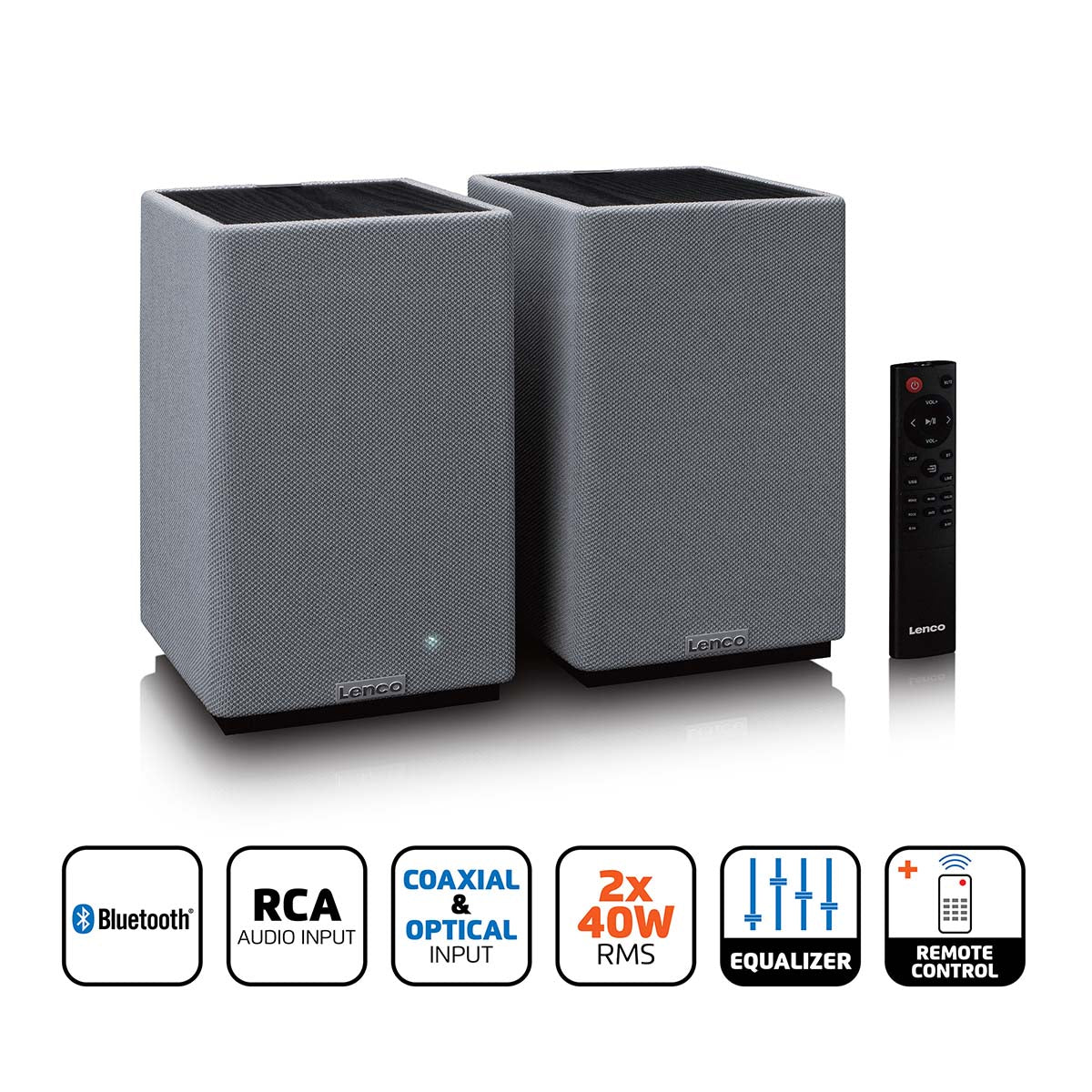 With their black and grey finish and compact size, the Lenco SPB-240BKGY bookshelf speakers make a stylish addition to any interior. They combine modern elegance with the durability and quality that Lenco is known for. Thanks to their user-friendly design and the included remote control, you can easily adjust the volume, input and your preferred audio source.