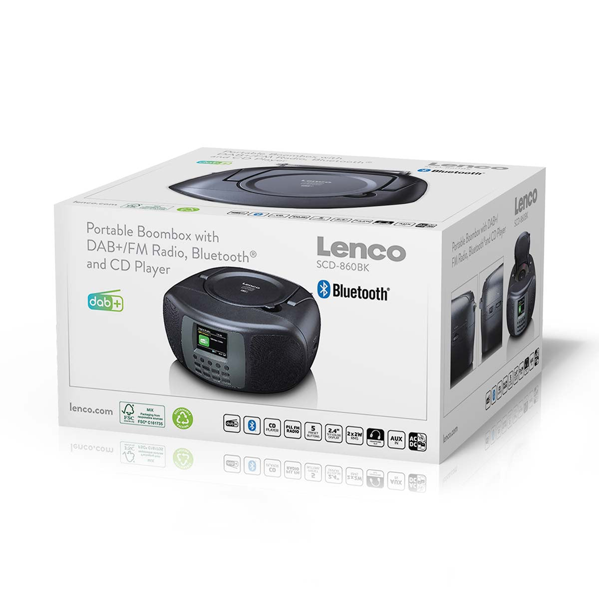 Discover the versatility of the Lenco SCD-860BK, a stylish portable DAB+/FM radio with Bluetooth® and a built-in CD player. Adorned in sleek black design, this radio seamlessly combines the latest digital technology with traditional functionalities. The compact design and the option to operate on both batteries and mains power make the radio suitable for home and on-the-go use. The 2.4-inch (6 cm) TFT LCD colour display not only imparts a modern look but also enhances user experience by presenting information and settings vividly.