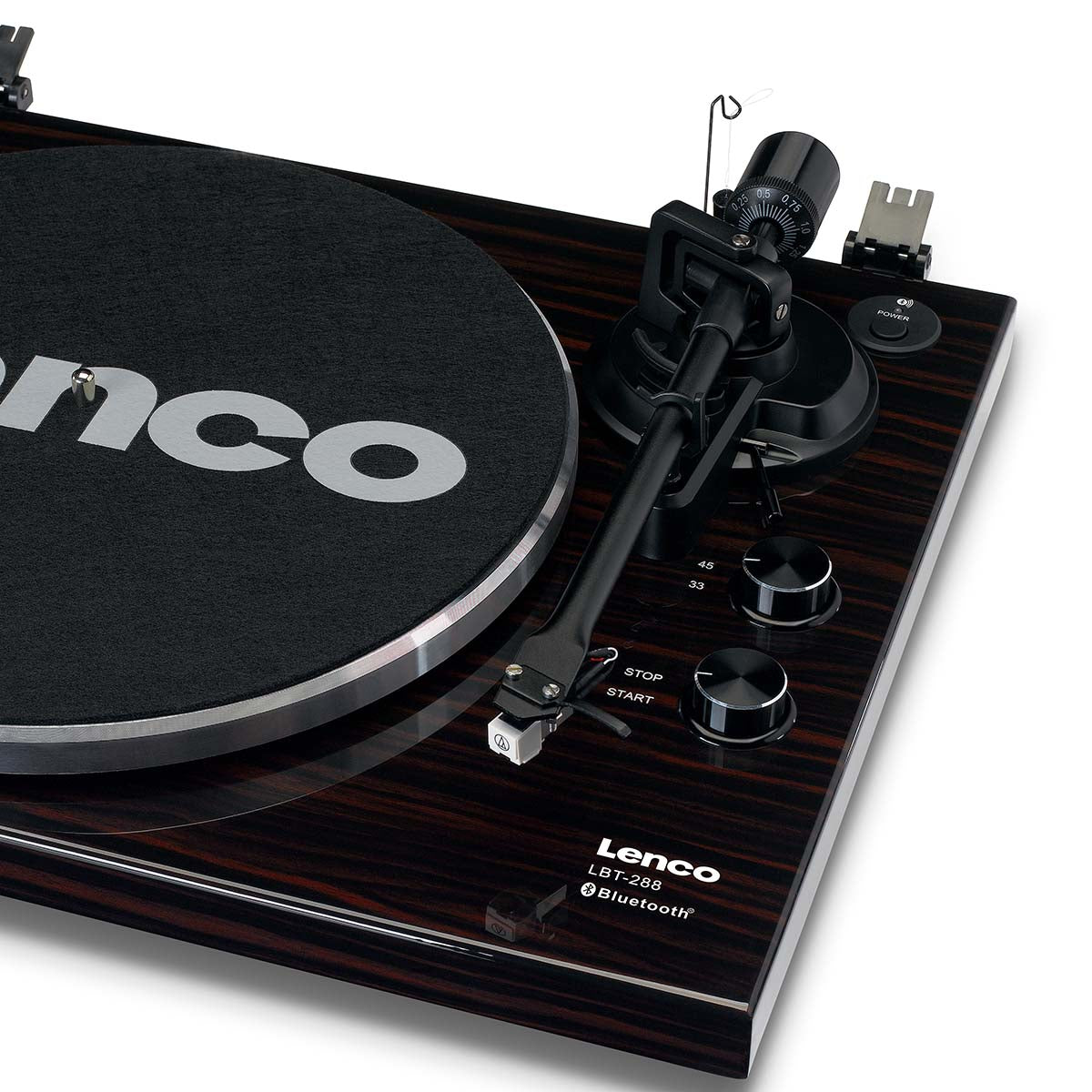 The Lenco LBT-288WA is a record player with Bluetooth® functionality. Connecting this record player to your Bluetooth® speaker or headphones is easy and convenient providing the ideal set-up for enjoying a full warm sound while lounging on your couch at home. Retrieve your old records from the attic and play them on this modern record player. Enjoy the crystal-clear sound of your vinyl, both old and new. Switch from 33 to 45 rpm to play your vinyl record at the right speed.
