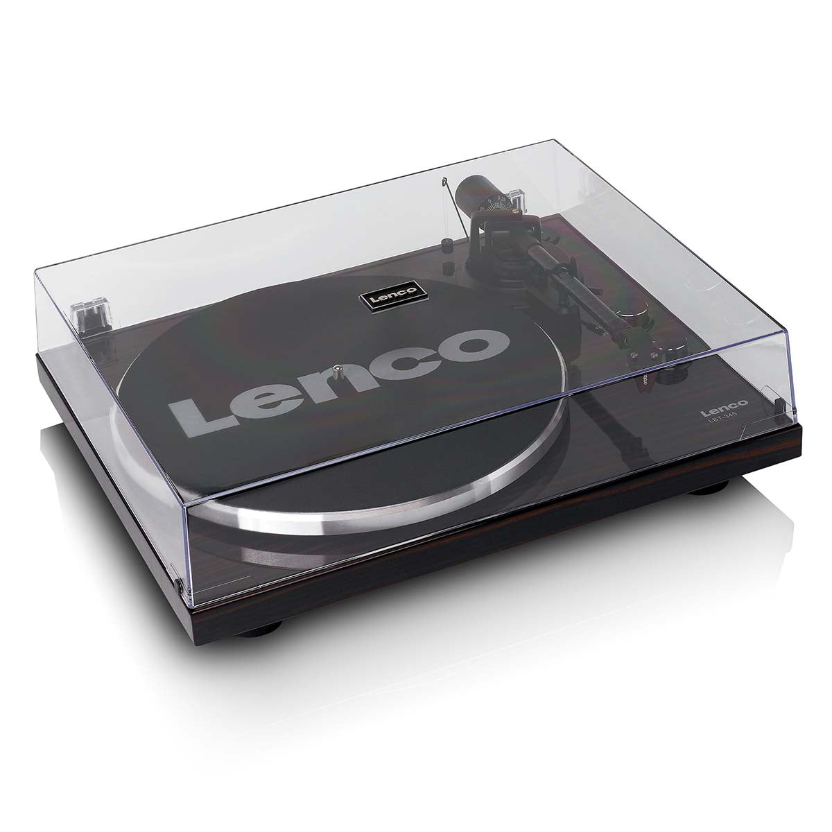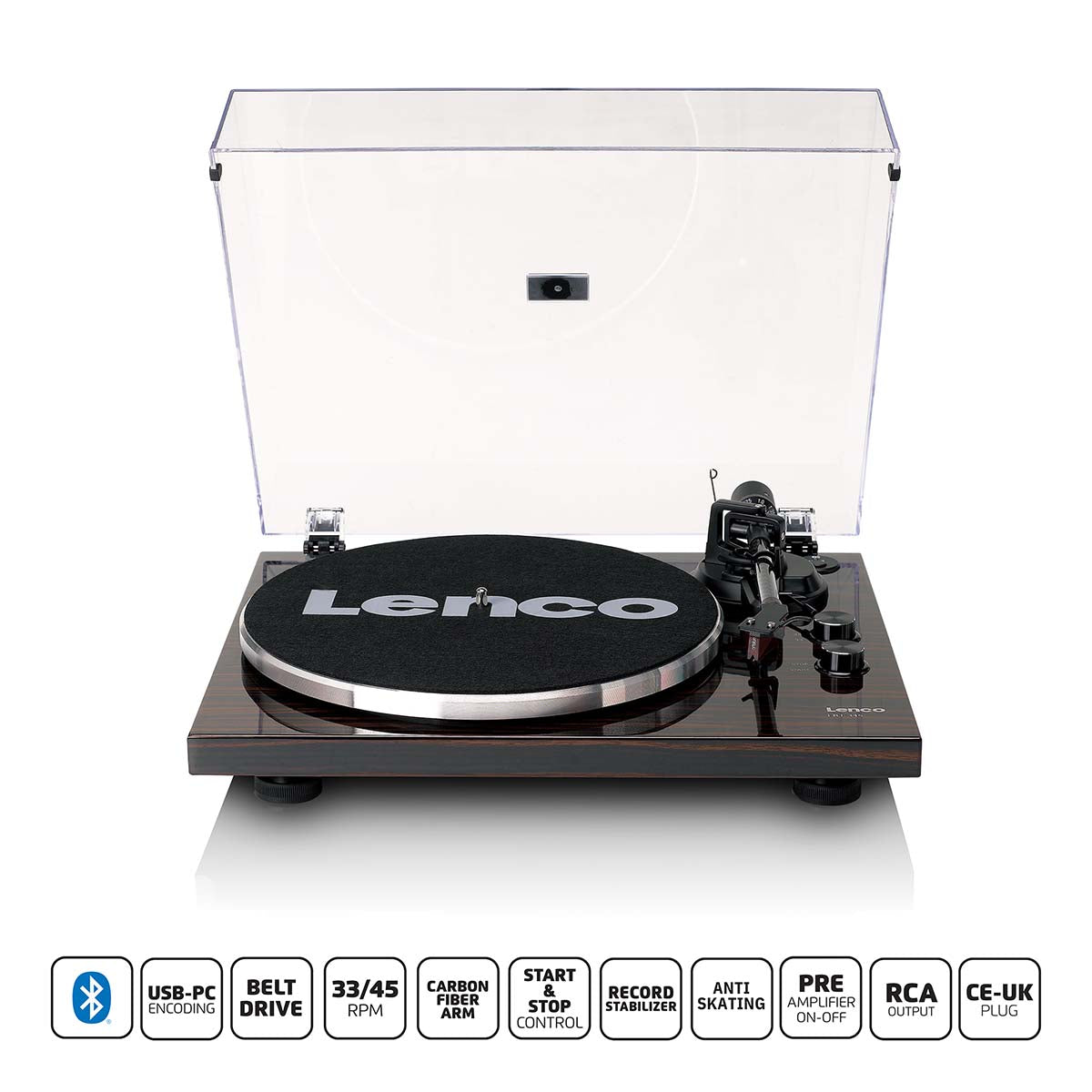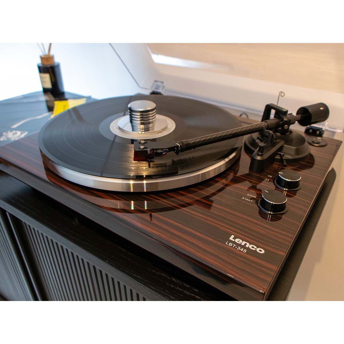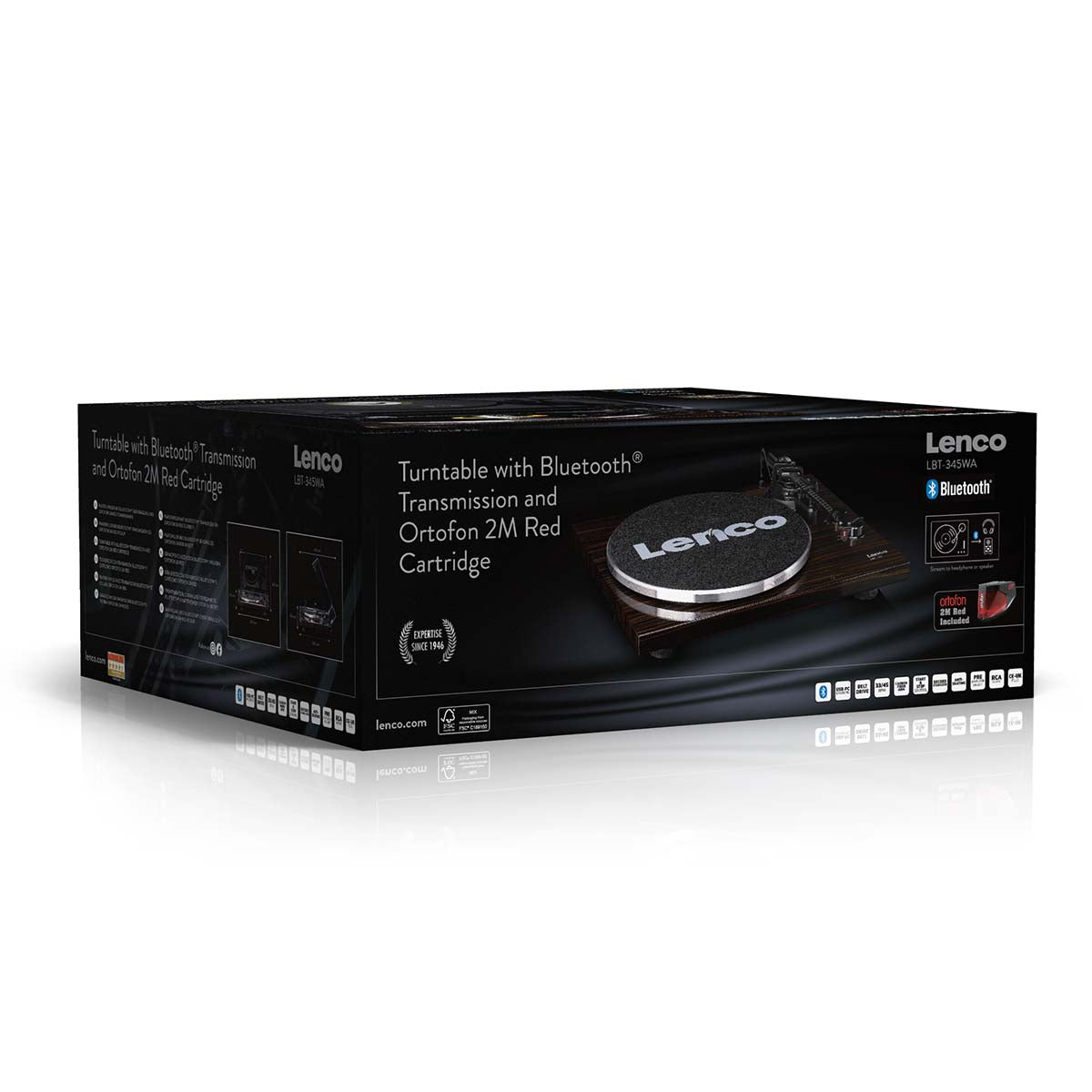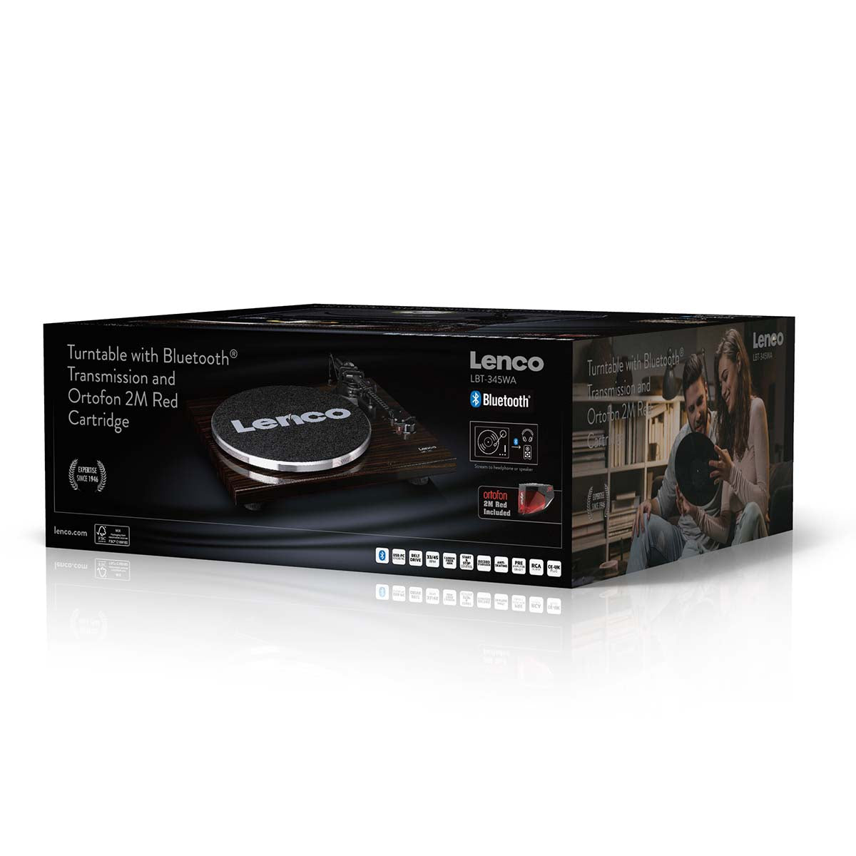 With great pride, Lenco presents the LBT-345WA, a high-end Bluetooth® record player from Lenco's Expertise line featuring a housing in an exclusive walnut color. The record player's design exudes elegance and style, while the warm tones add a touch of refinement to the overall aesthetic. As a result, the belt-driven LBT-345WA not only guarantees a sophisticated and detailed audio playback but also provides visual delight in any stylish interior setting. The record player is further defined by the award-winning Ortofon 2M Red cartridge, designed for true enthusiasts, bringing every note to life with precision. What makes the LBT-345WA even more exclusive is the addition of a chrome-plated record stabilizer, among other features such as a metal record player platter, a carbon fiber tonearm with a counterweight, start-stop operation, a felt slipmat, and a detachable dust cover.