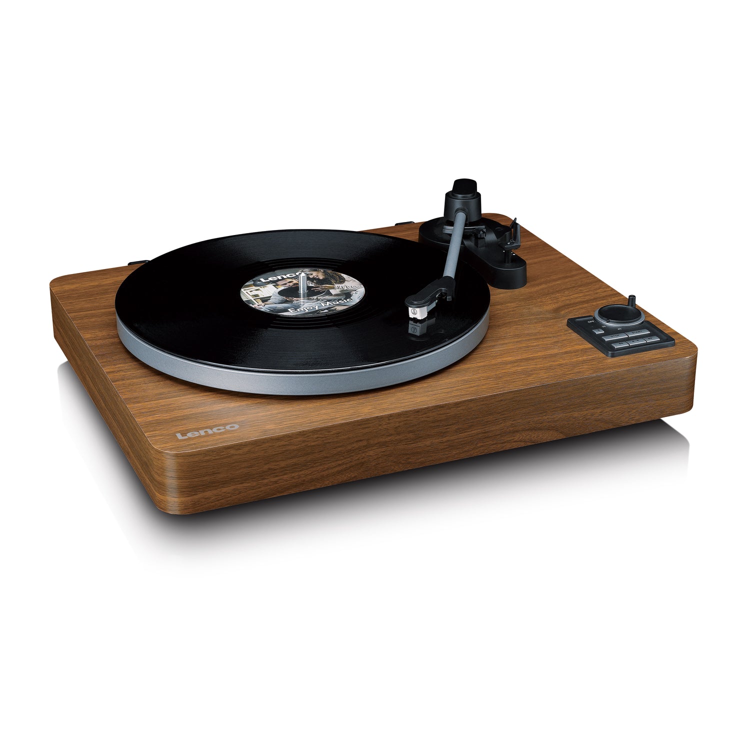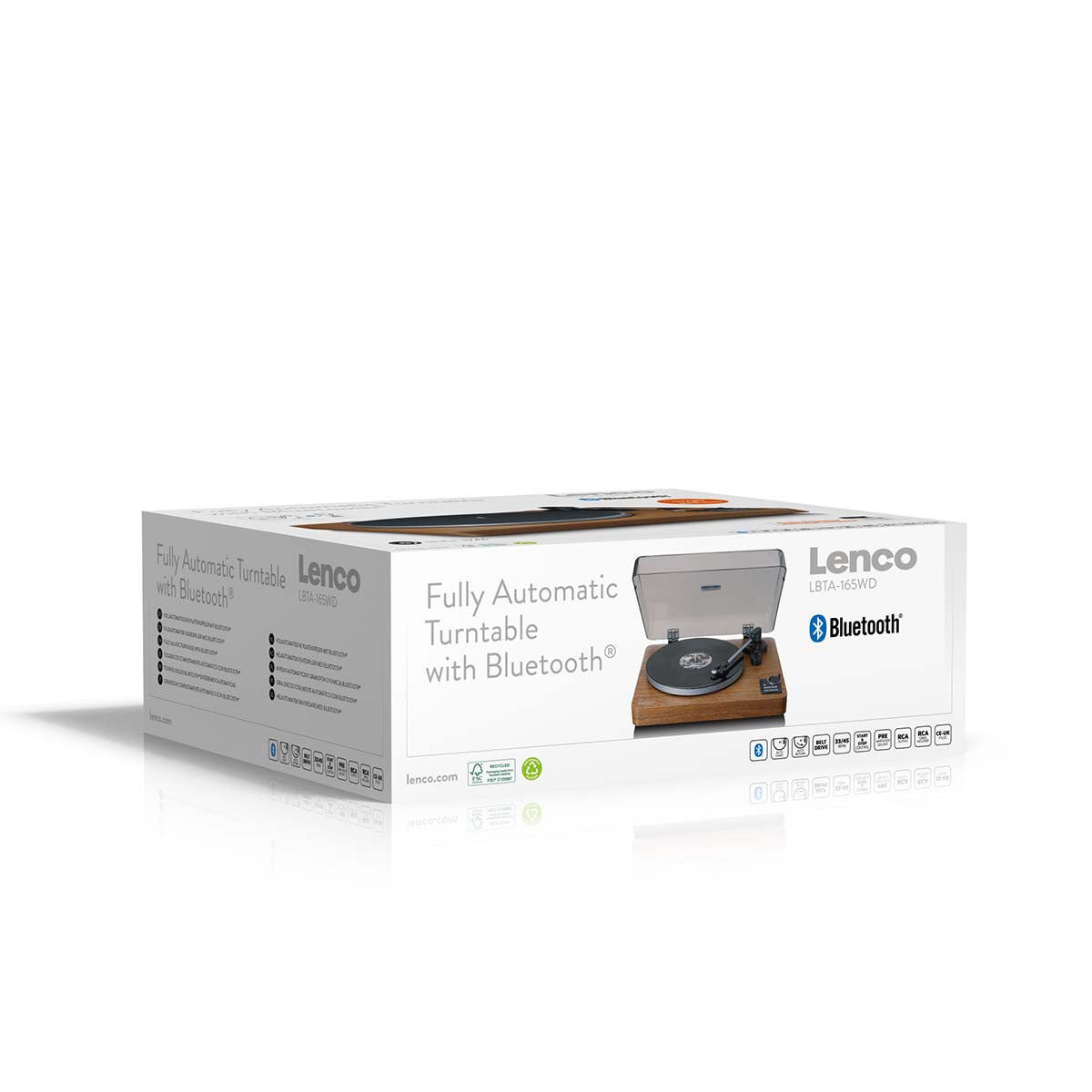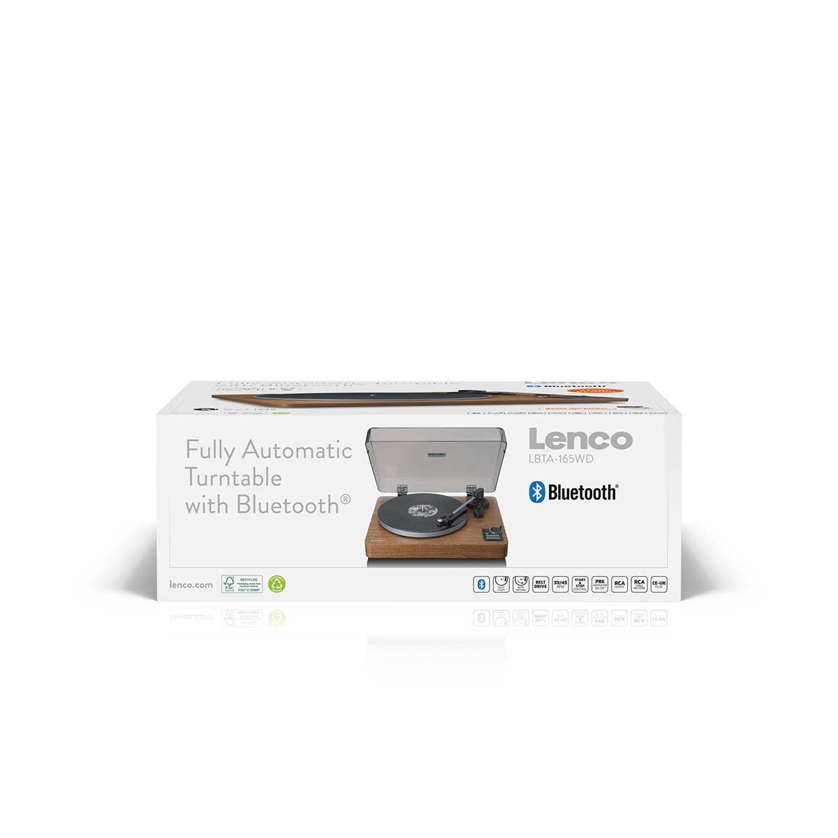 The Lenco LBTA-165WD is a fully automatic record player that combines the best of traditional vinyl sound with modern technology. Thanks to auto start and auto return, minimal manual interaction is required: the tonearm automatically moves to the correct position and returns to its resting position after playback. With Bluetooth® 5.3 transmission, you can easily stream your favourite music to any compatible speaker or headphones, while the built-in pre-amplifier ensures a rich, dynamic sound. The LBTA-165WD combines a wooden casing with a metal turntable platter and a metal tonearm fitted with an AT3600L cartridge. This gives the record player a stylish look and provides the stability and sound quality essential for an exceptional listening experience. Order now and experience the perfect combination of vintage charm and modern technology with the Lenco LBTA-165WD.