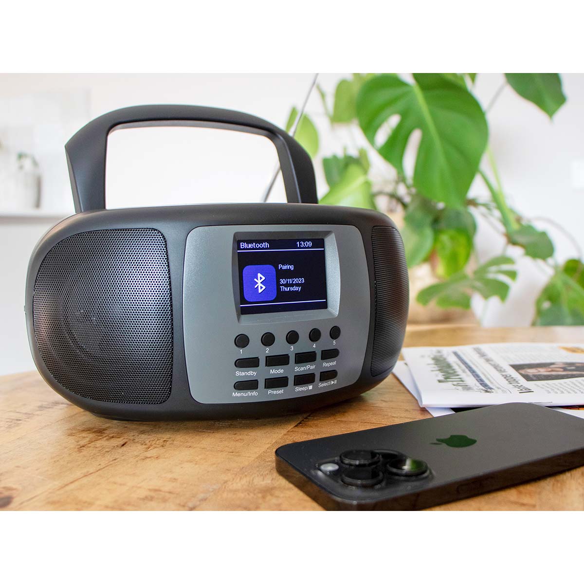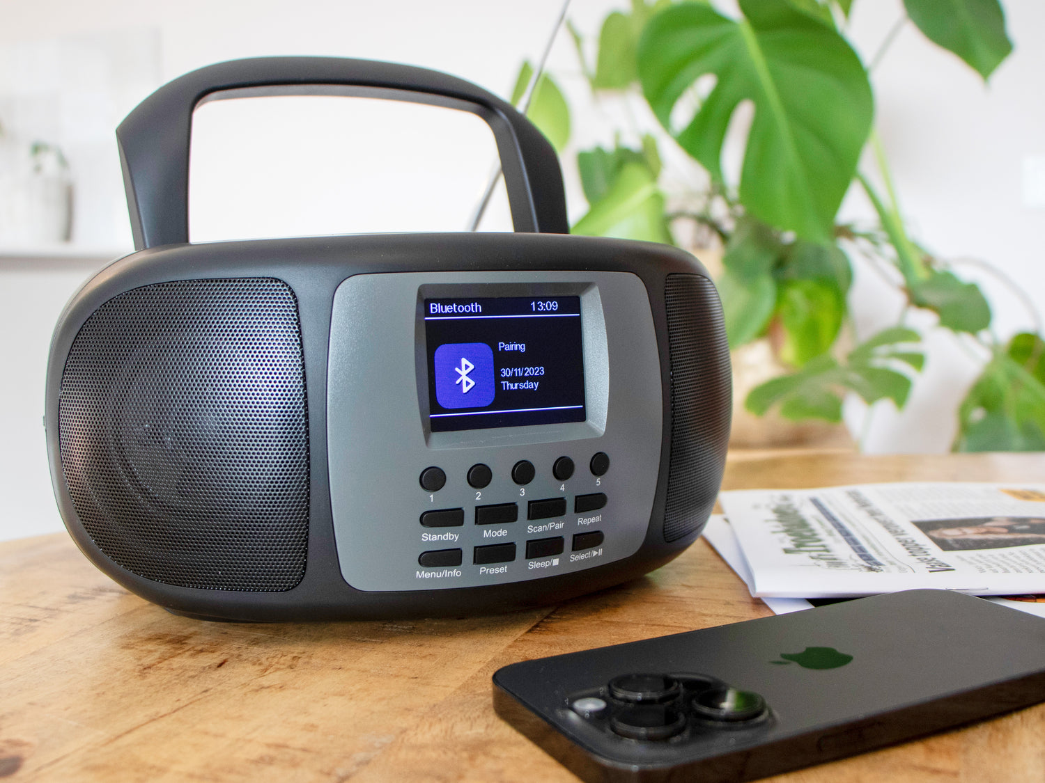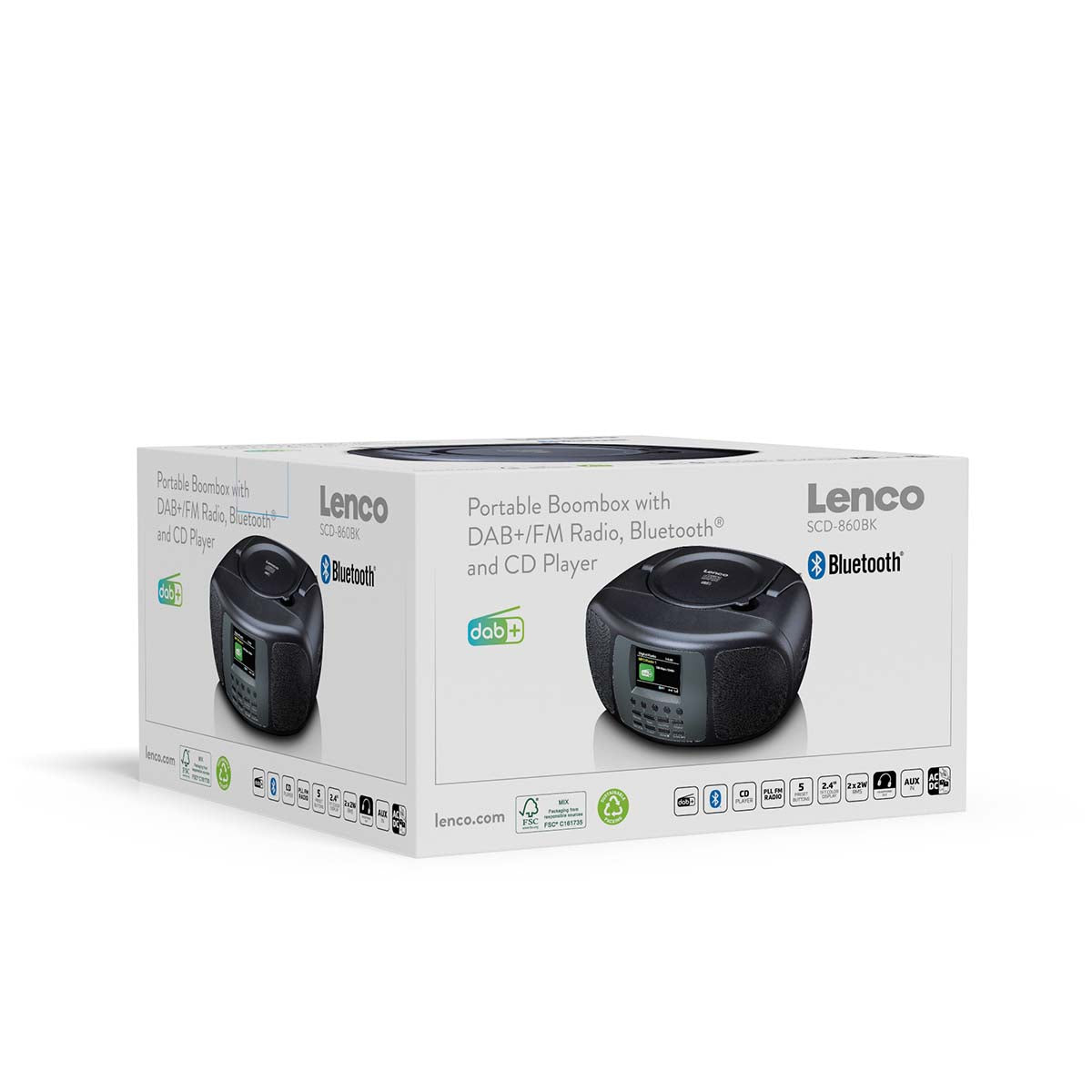 Discover the versatility of the Lenco SCD-860BK, a stylish portable DAB+/FM radio with Bluetooth® and a built-in CD player. Adorned in sleek black design, this radio seamlessly combines the latest digital technology with traditional functionalities. The compact design and the option to operate on both batteries and mains power make the radio suitable for home and on-the-go use. The 2.4-inch (6 cm) TFT LCD colour display not only imparts a modern look but also enhances user experience by presenting information and settings vividly.