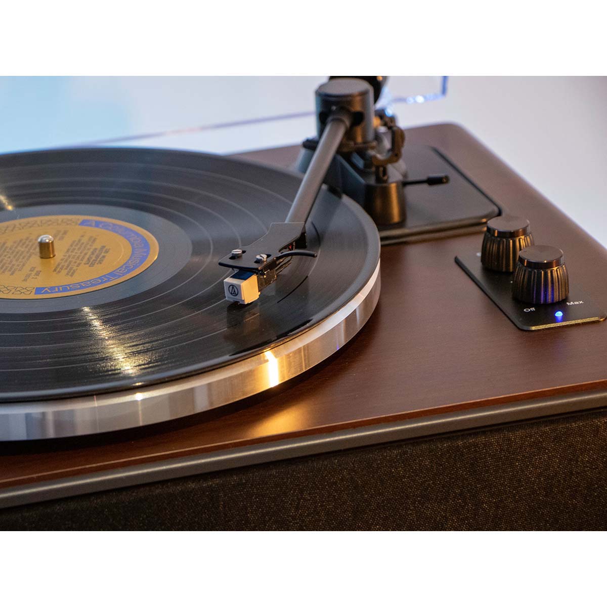 The record player comes with an Audio Technica AT-3600 Moving Magnetic Cartridge (MMC). This element, containing the needle that tracks the grooves of your vinyl records, ensures that each note comes to life with precision.