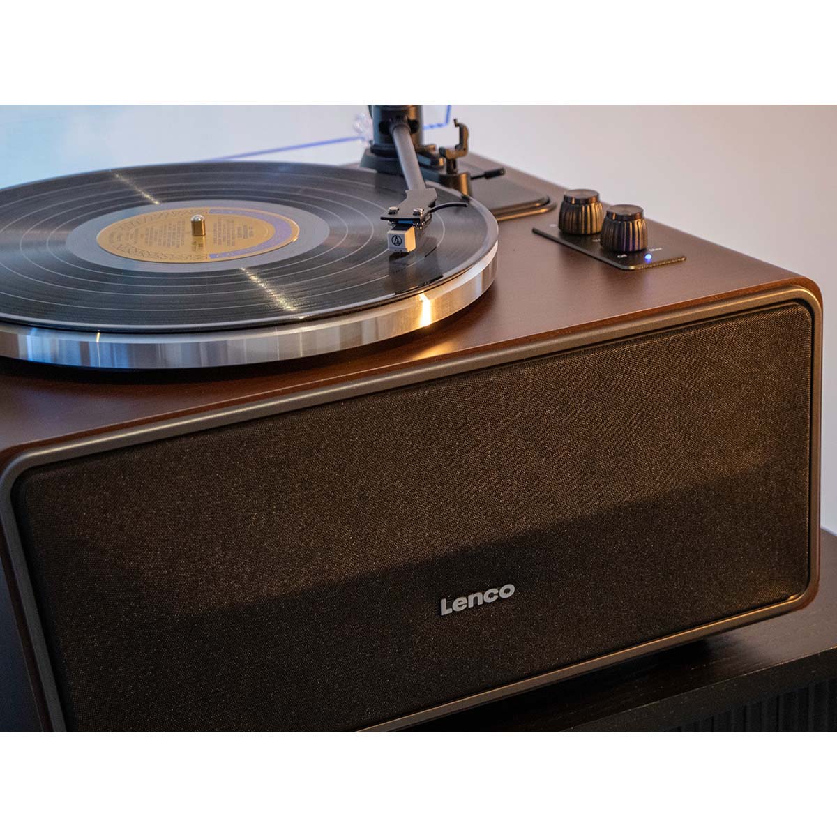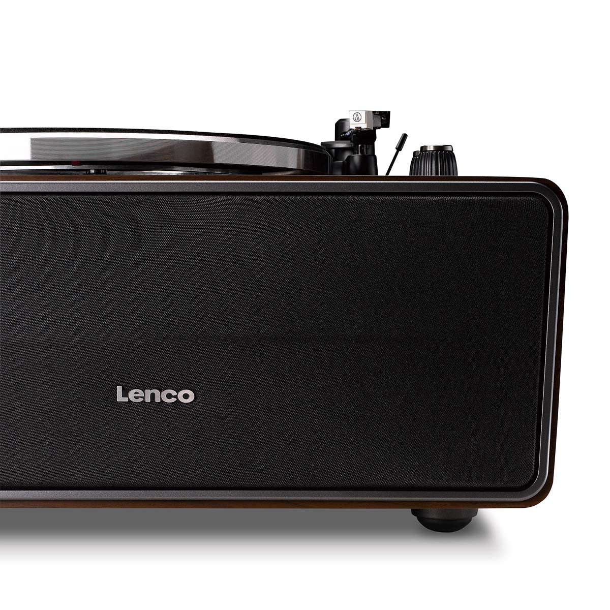 Introducing the Lenco LS-470WA, an all-in-one record player from Lenco's Expertise line with a stunning, robust design in the elegant walnut colour. The LS-470WA is a record player with built-in speakers, belt drive, and Bluetooth®, featuring a high-quality Audio Technica cartridge. The detachable dust cover protects your record player from dust, while the unique design and elegant dark wood finish add a touch of class to the immediate surroundings of the record player.
