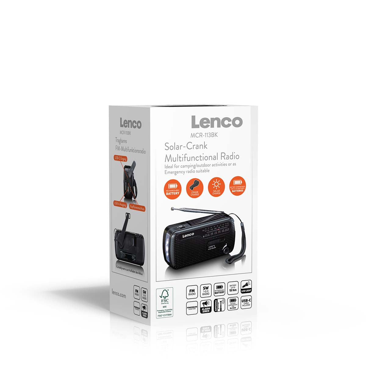 This MCR-113BK emergency radio from Lenco is an all-in-one portable radio with multiple practical features. The radio can also be used as a flashlight or power bank. The greatest advantage of this radio is that it does not require a nearby power outlet nor does it need batteries. You can generate the necessary power yourself by using the hand crank or the solar panel on top of the radio to charge it. Should there be power available, you can also charge the Lenco MCR-113BK with a USB-C cable.