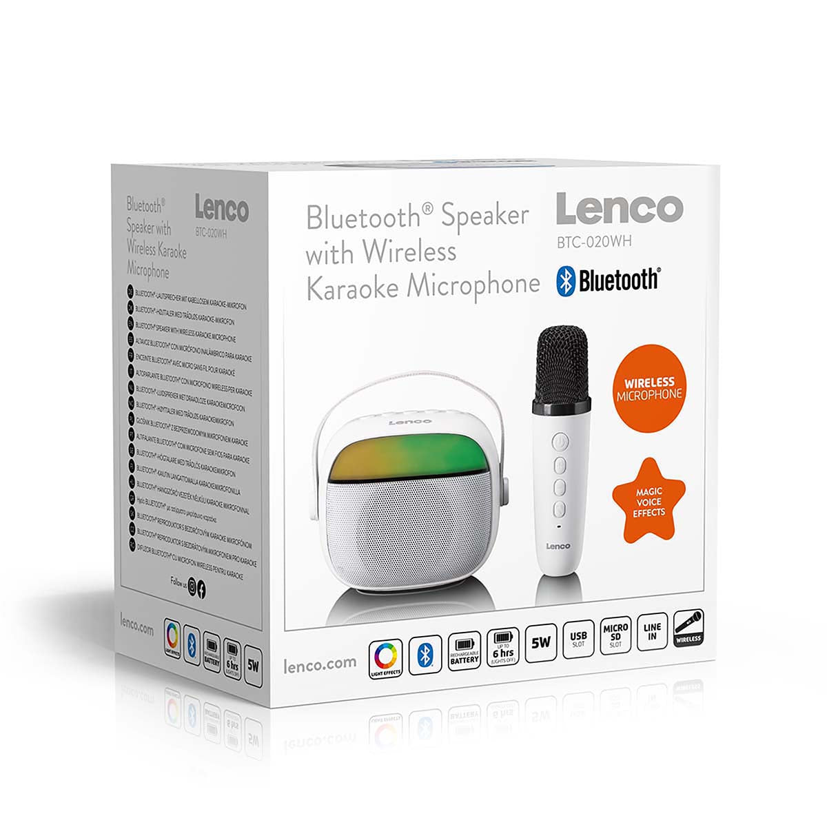 With the Lenco BTC-020WH, you bring a compact and user-friendly karaoke speaker into your home, complete with Bluetooth®, a rechargeable battery, a wireless rechargeable microphone and colourful LED light effects. This small powerhouse is perfect for spontaneous karaoke moments, children’s parties or simply enjoying music together. Thanks to its lightweight and portable design, you can easily take the BTC-020 anywhere. Connect your smartphone, play your favourite song and start singing.