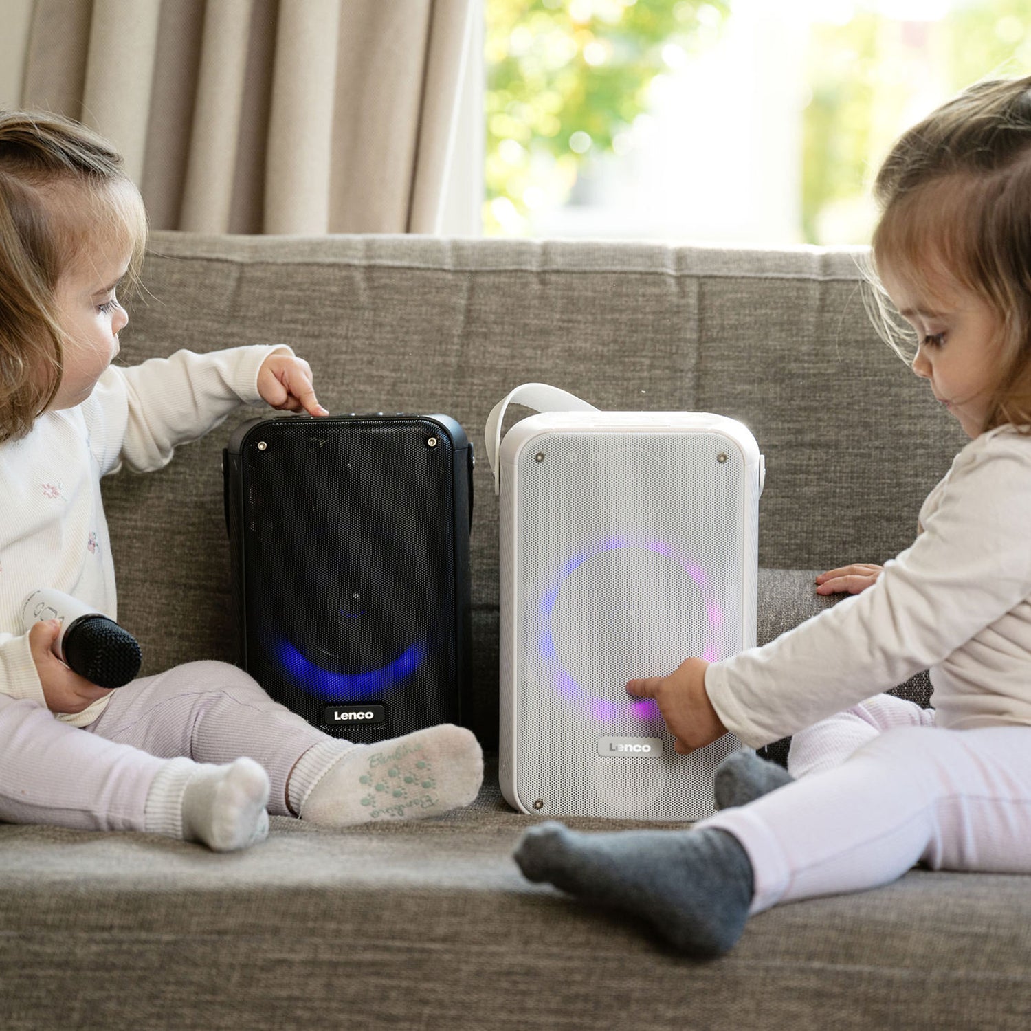 With the Lenco BTC-060WH, you're getting a complete karaoke set equipped with Bluetooth®, rechargeable battery, wireless rechargeable karaoke microphone, disco LED lighting, and a remote control with sound effects and voice changer. We can hardly imagine it, but aren't you a fan of karaoke? The BTC-060WH is still the right choice for you. The karaoke microphone conveniently stores in the Bluetooth speaker. With its portable design and a weight of just 1.42 kg, take the speaker anywhere you go. Enjoy up to 12 hours of uninterrupted fun with the built-in rechargeable 2400mAh battery. With the Lenco BTC-060WH, the party is literally in your hands! Let's get this (karaoke) party started!