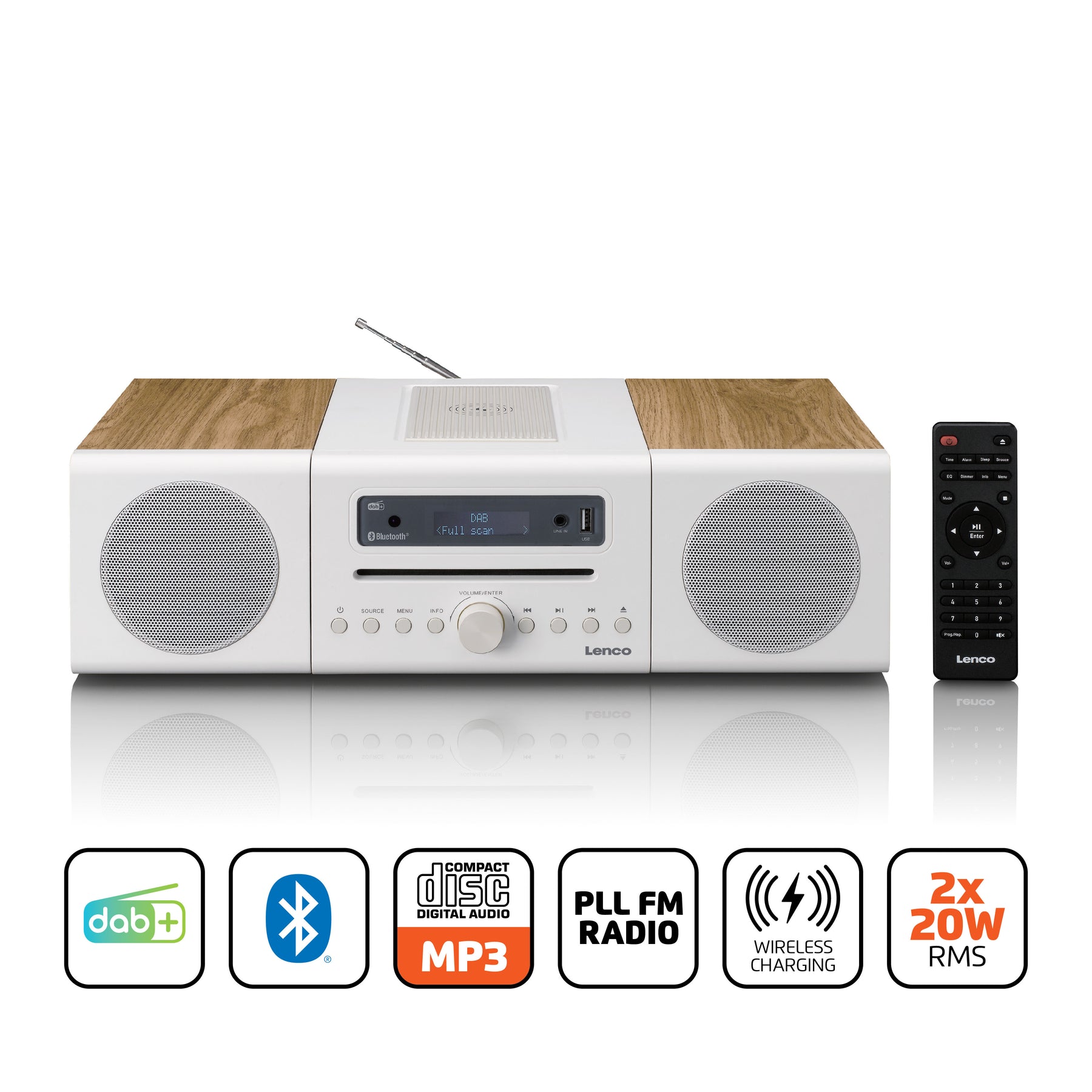 Discover the Lenco MC-375WHWD, the latest model in Lenco's MC series. The MC-375WHWD is an advanced HiFi stereo system designed to seamlessly meet your musical and technological needs. This stylish wood-finished set offers a rich blend of features and technologies, allowing you to fully enjoy both classic and modern music sources. With a powerful output of 2 x 20 Watts RMS, the high-quality speakers fill any room with balanced and dynamic sound. Easily control the stereo system with the included remote control for ultimate convenience.