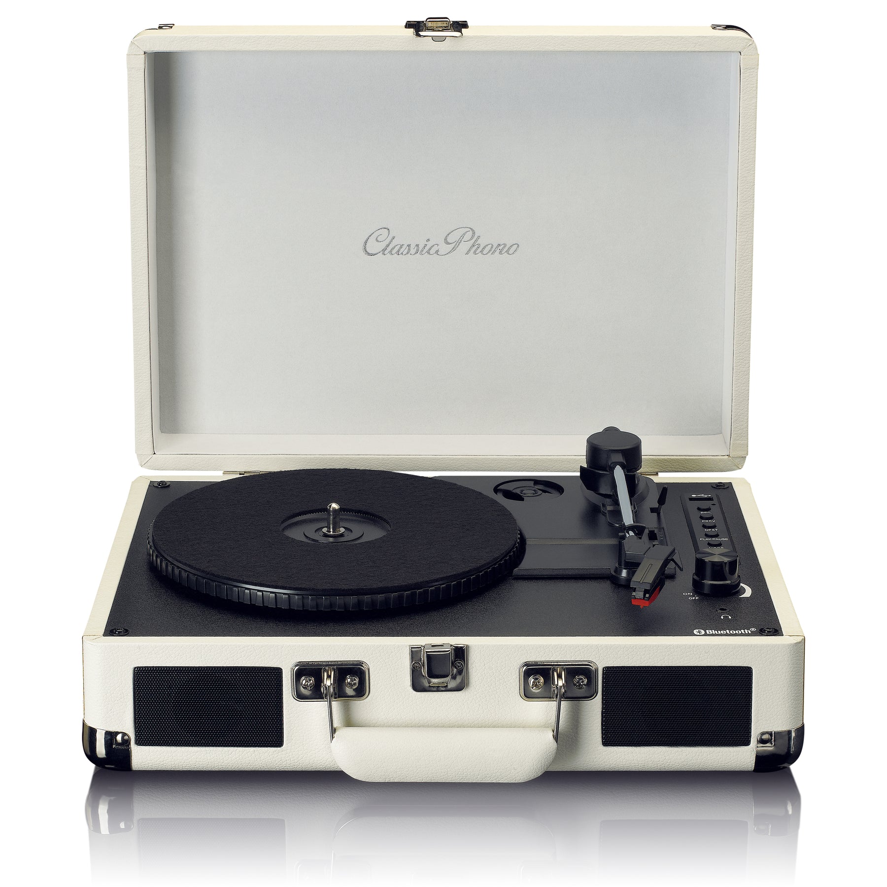 This Bluetooth® record player is available in black and cream.