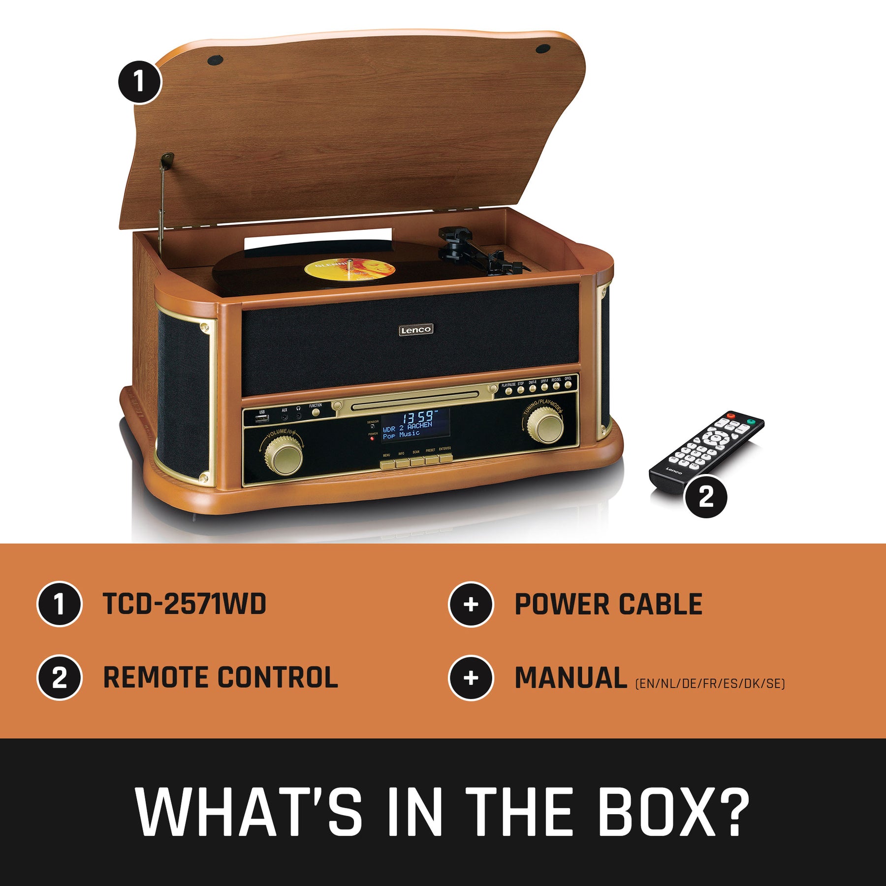 The Classic Phono (by Lenco) TCD-2571WD is an all-in-one multifunctional music system with a stunning retro design that enhances any interior. The TCD-2571WD is characterized by the built-in record player with belt drive but offers so much more. Effortlessly blending classic functionalities with modern playback options, the wooden retro record player features Bluetooth® reception, DAB+/FM radio, a built-in CD player, and a cassette player. This provides a complete listening experience with the perfect balance between the nostalgic charm of vintage aesthetics and modern functionality. The TCD-2571WD has an MDF housing and comes with a remote control for added convenience.